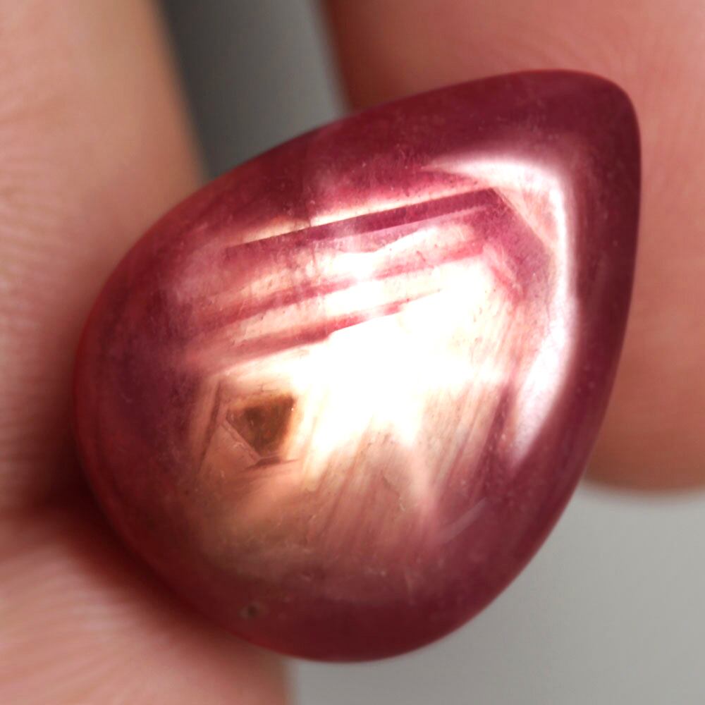 私が直接輸入した品です。タンザニア産の天然超大粒 6 Rays スタールビールース。カットはオーソドックスなペアカボションで、色は Pinkish Red です。アイレベルのインクルージョン(スターの場合はインクルージョンはあるのが普通ですが、肉眼でも確認できるという意味です)。自然光(太陽光など)、ペンライトの下共に、スターは見られません。スターになろうとしてなれなかったという感じでしょうか。写真のスターらしき部分が、ただのインクルージョンになってしまっています。大きさを加味しても、グレードは【A】。この価格でご提供できるのは、直輸入直販だからこそです。