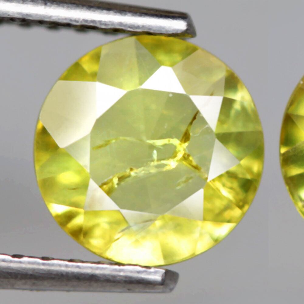 私が直接輸入した品です。マダガスカル産の天然スフェーン。カットはラウンドカットで、色は Yellowish Green です。1個はアイクリーンですが、もう一つにはアイレベルの傷があります。ルーペレベルではインクルージョンや傷があります。総合的なグレードは【A+】。この価格でご提供できるのは、直輸入直販だからこそです。