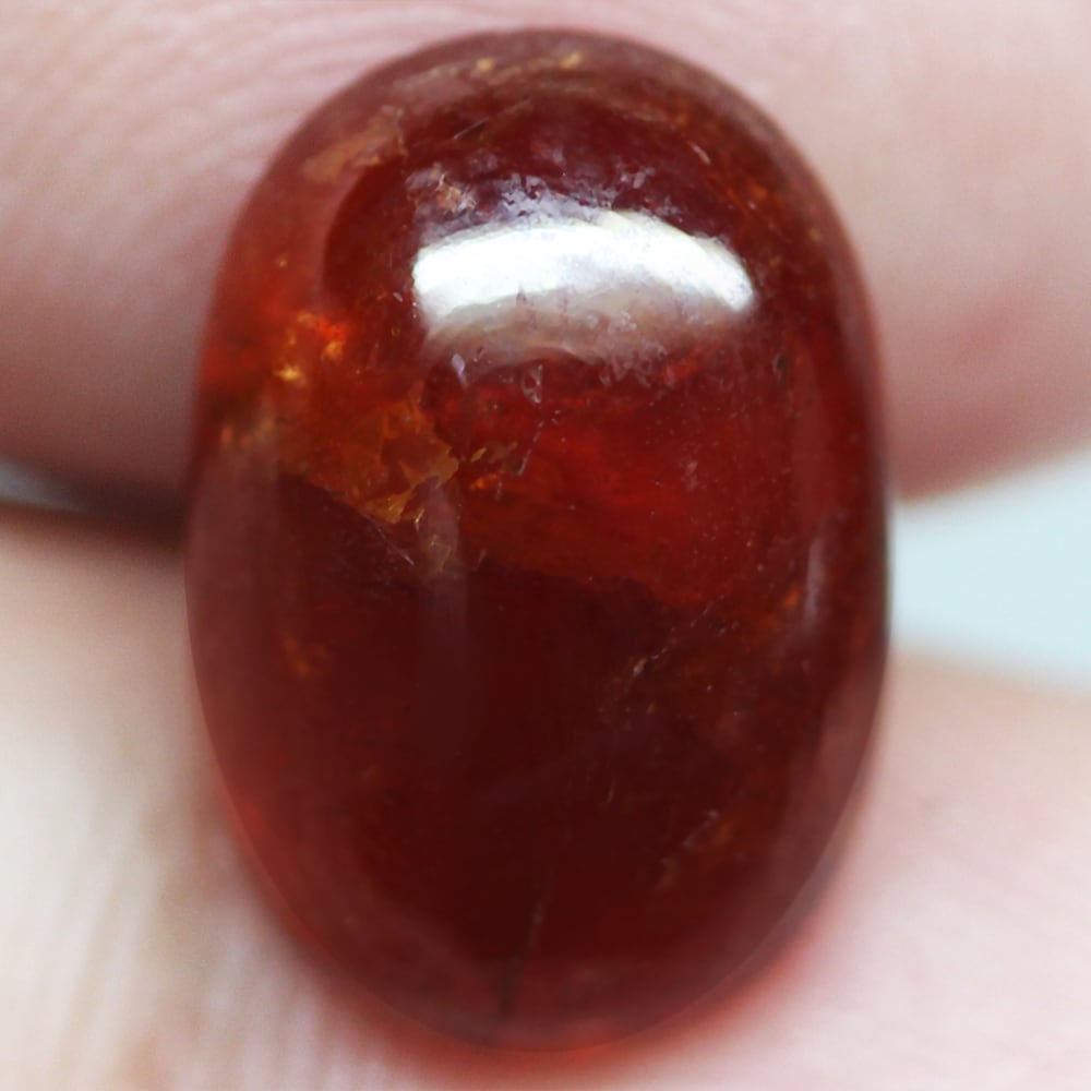 私が直接輸入した品です。ナミビア産の超大粒天然スペサルタイトガーネットルース。カットはオーソドックスなオーバルカボションで、色は Orange です。アイレベルのインクルージョン。ルーペレベルでは複数のインクルージョンと傷があります。グレードは【A+】。この価格でご提供できるのは、直輸入直販だからこそです。